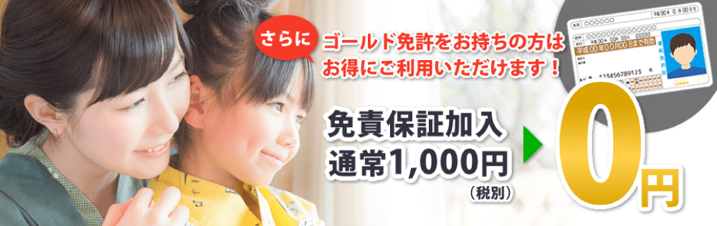 ゴールド免許の方は通常1,000円(税別)/1日の免責保証が無料!