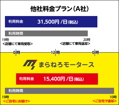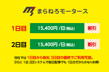 他社レンタカーの場合、2日目以降に割引が適応されるケースが多いですが、「宅配レンタカー」では初日から割引適応額でご案内します。 一日のご利用が最も多いなら、一番多いプランを安くするのが当社の強みです!