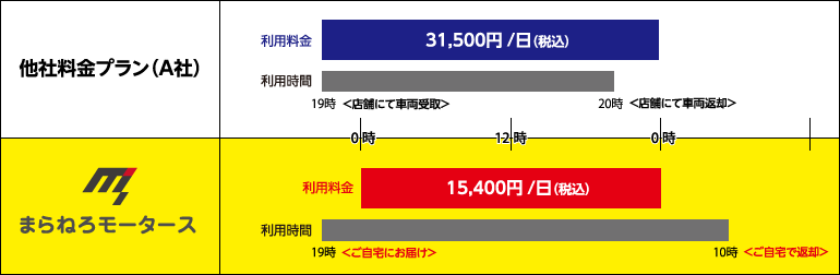 当社のレンタカーシステムは日貸し専門になります。レンタカー業界で最も利用者が多く、利用頻度の高いサービスに特化させる事で、低価格と 優れたサービス性を両立しております。「宅配レンタカー」は配車引取システムを採用しているからといってレンタカー費は高くなりません! あえて「他社よりも安い設定」で頑張っています!